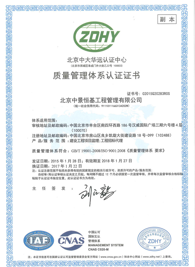 北京中景恒基工程管理有限公司(以下簡稱“公司”) 具有工程監理綜合資質、造價咨詢甲級資質、水利工程、人防工程監理資質和工程招標代理資質,是全國百強監理企業之一。主要從事工程監理、造價咨詢、項目管理、招標代理等咨詢服務 業務。 公司自成立以來,始終注重自身建設,強化內部管理,形成了一套標準化、信息化、科學化的管理模式。率先通過了ISO9001質量管理體系、IS...